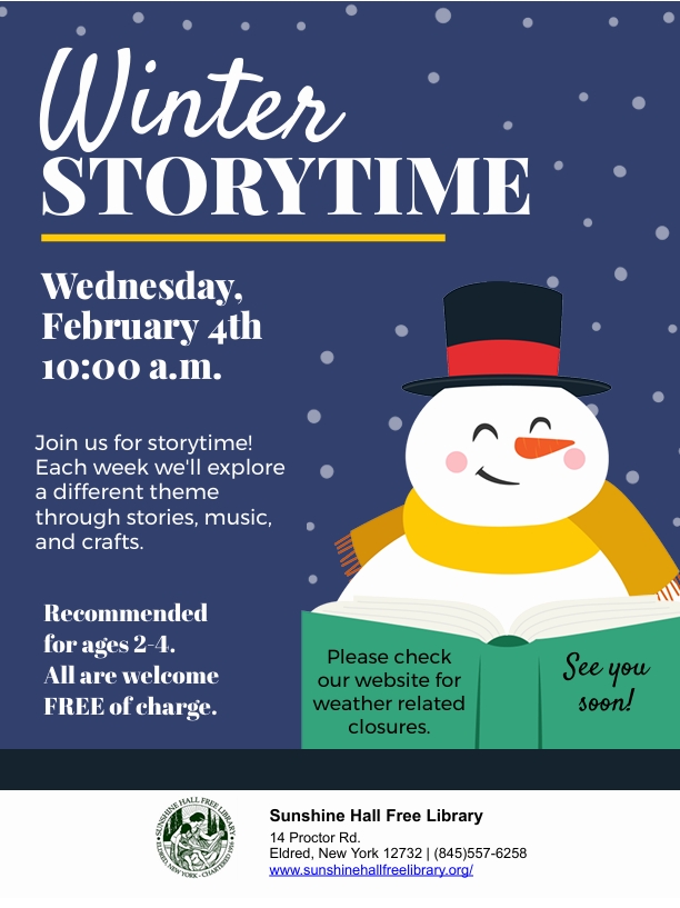 Storytime will return on Wednesday, February 4th! We look forward to seeing you soon!