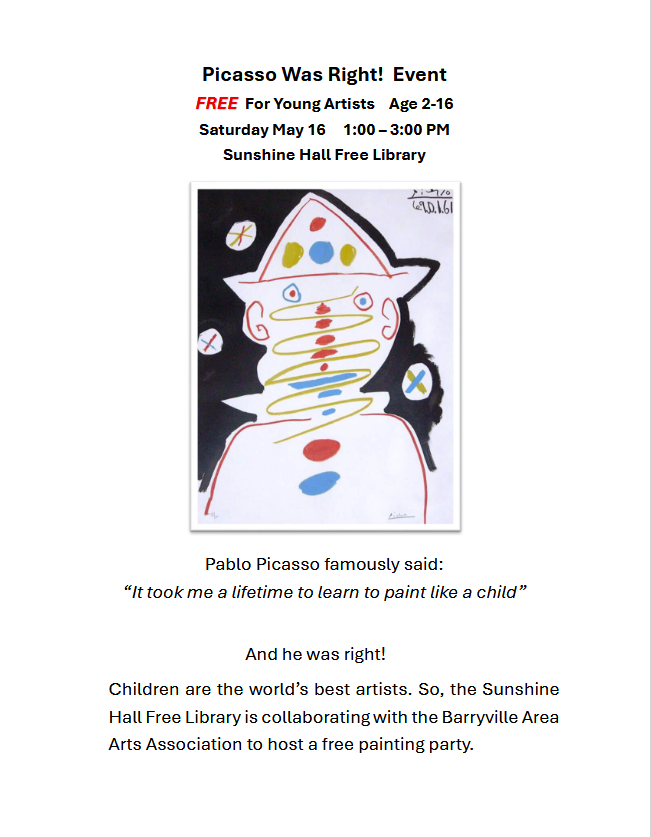 Join us on Saturday, May 16th, 1-3pm at the Sunshine Hall Free Library for FREE painting party! For ages 2-16. We will have snacks and all the art supplies you need to paint, explore and be creative!