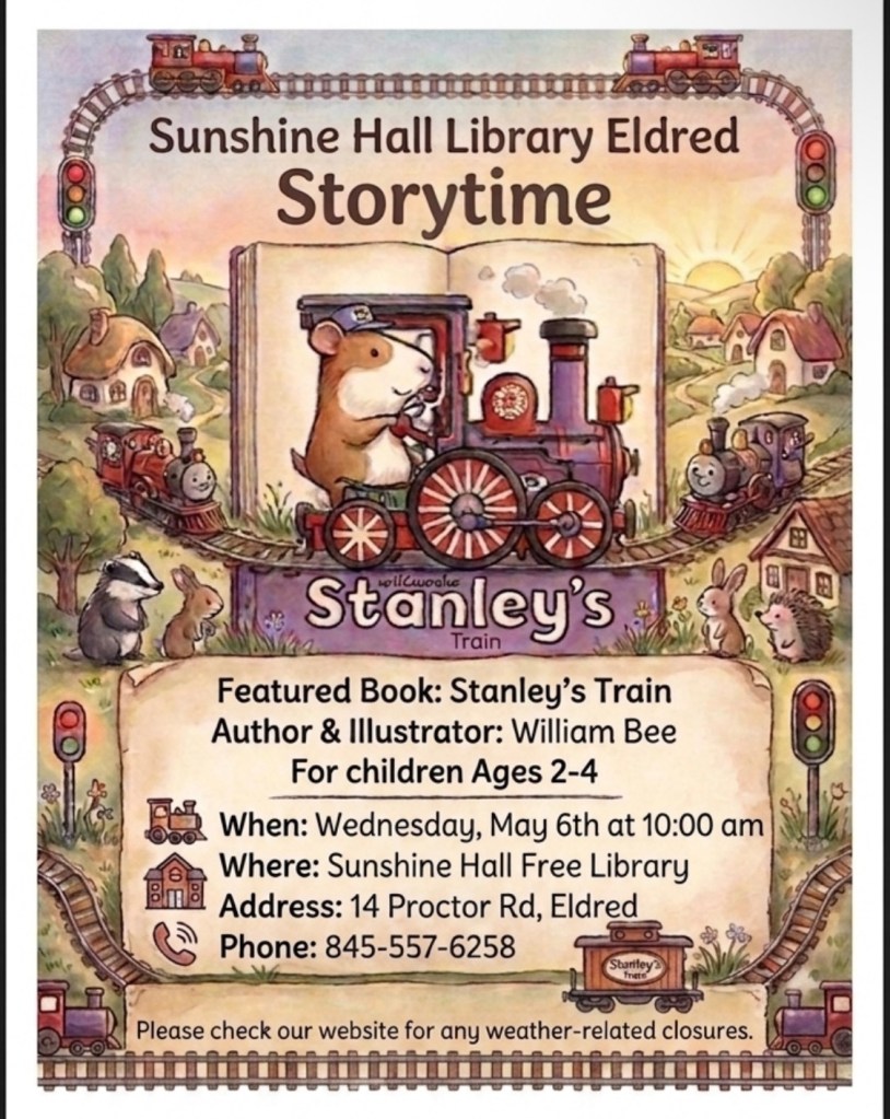 All aboard for some Storytime fun on May 6th with “Stanley’s Train” by William Bee!! Choo choo!!