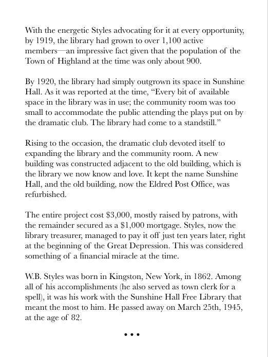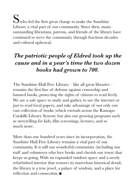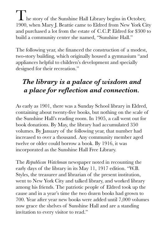 The mission of the Sunshine Hall Free Library is to be a valuable resource, and a benefit, to everyone in our community.